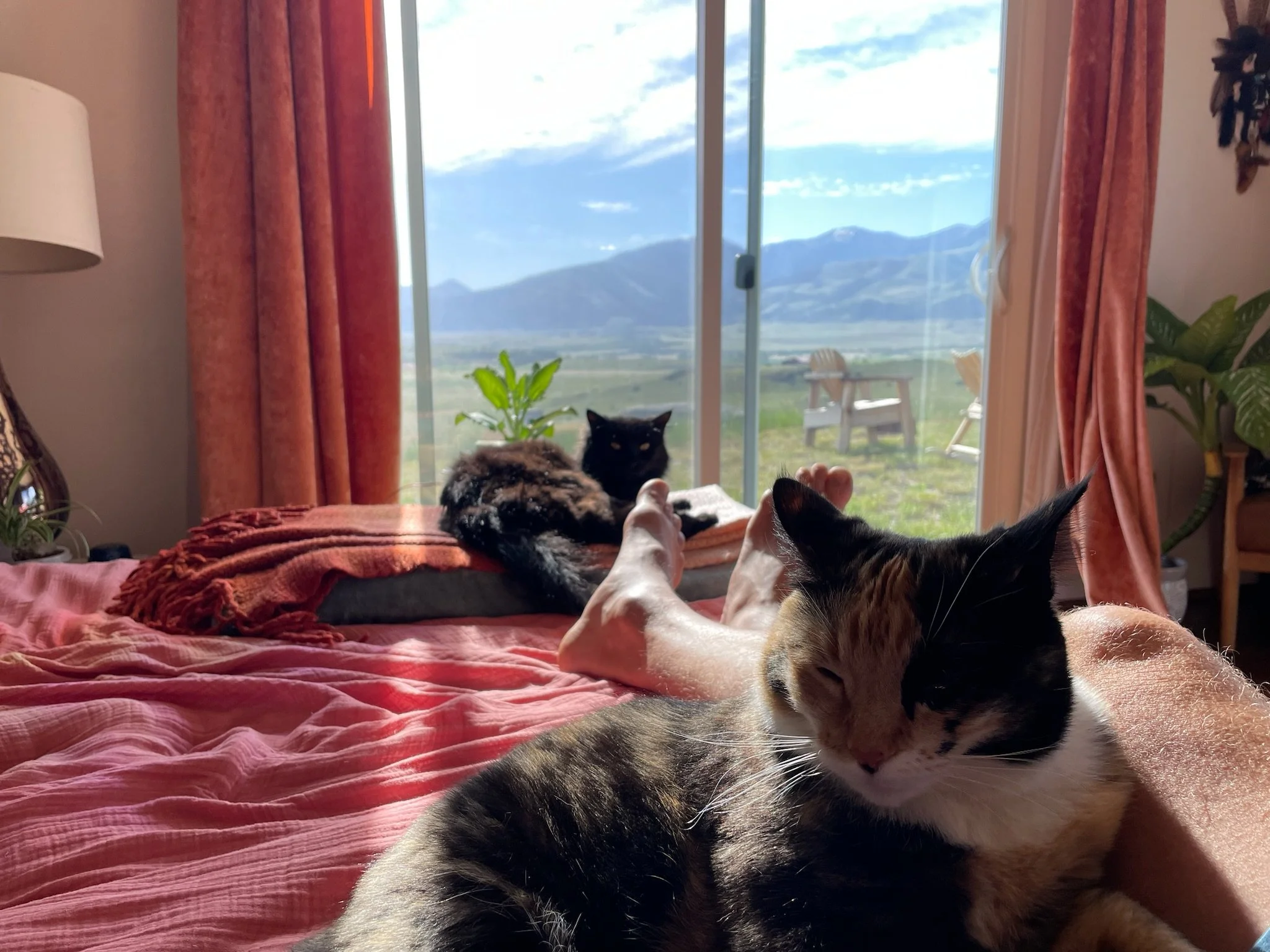 Your accommodations are in our guest bedroom that we call the Crown Jewel. It has cork floors, big sliding glass doors that open out to one of the most spectacular views imaginable, a Sonos special audio speaker, and Hue lighting. You have your own bathroom and the hot tub is just outside your door. When you open the windows, you step into Paradise Valley at its grandest. The cats also love to sleep in this room, but we have other accommodations if cats aren't your thing or you would like a little extra privacy from the house.