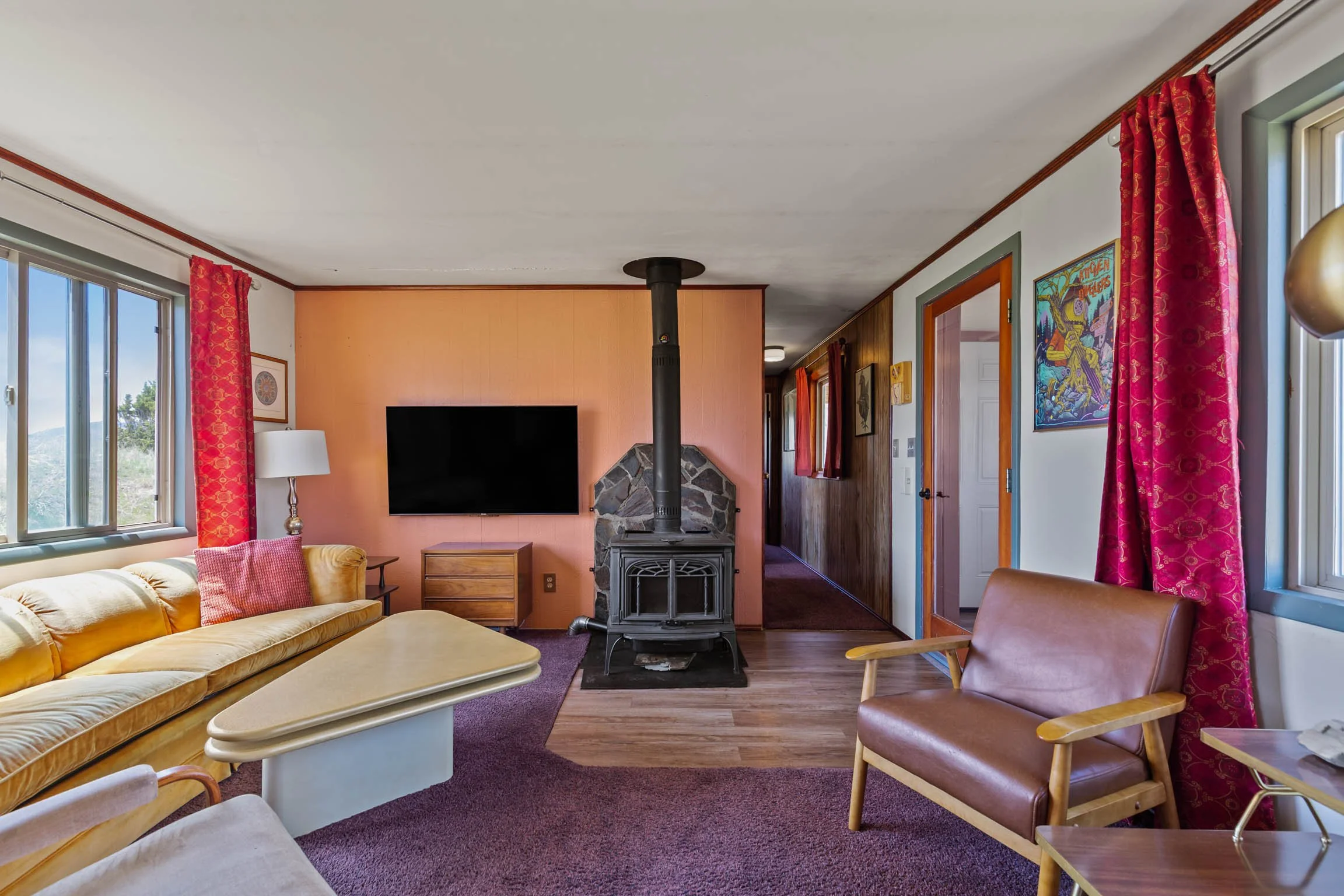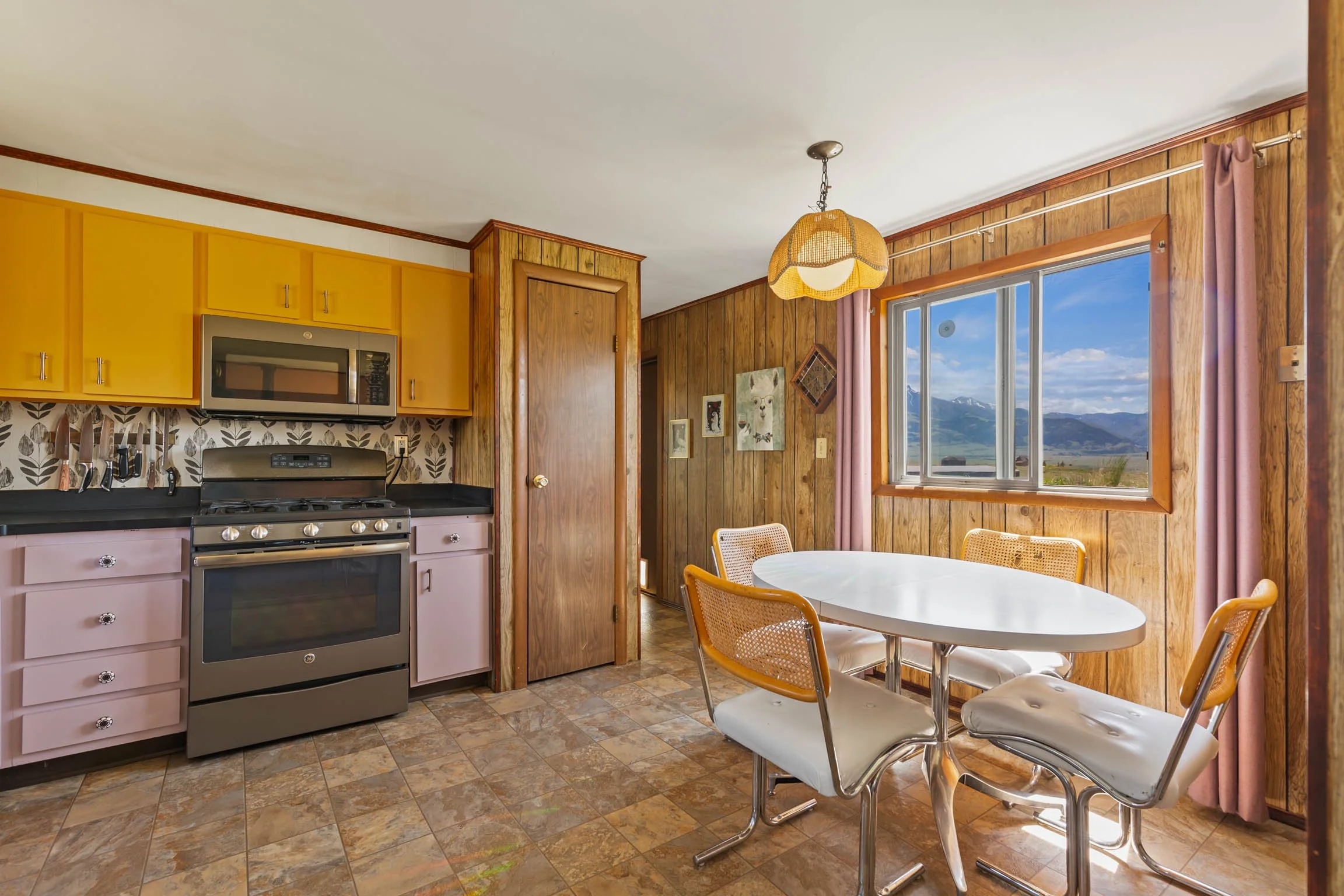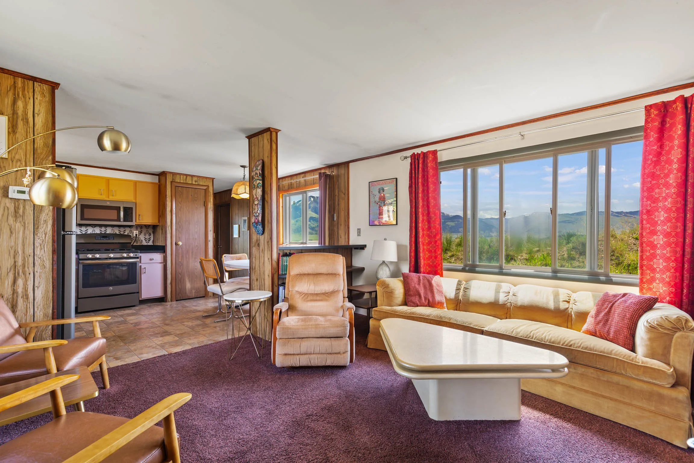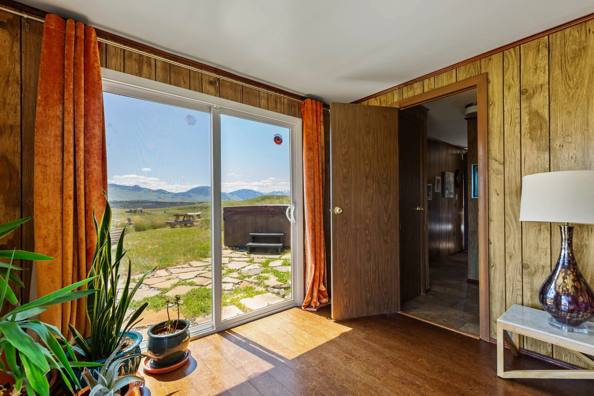🏡 House Details: 3 beds, 2 baths. Modular home built in 1976; no title required for sale. Newly remodeled in 2019. Well water, gas range stove, kitchen appliances updated in 2019, propane and wood burning heating, large glass sliding doors in front room with 180-degree view of Absorka mountains, 7-person hot tub, washer and dryer, mud room entry, RV 30-amp plug, and potential for fully furnished upon request. The house was thoughtfully designed to bring in elements of the natural world right outside the door. The burgundy / mauve rugs matches many of the rock formations outside and give it that retro vibe, the orange cabinets draw from the lichen on many of the rocks, and the purple-hues draw from the flowers that grow in the summer. The front room, affectionately called the Crown Jewel, has cork floors for warmth during winter months if you are using the room for yoga or exercising, and just an overall high end look. The kitchen has black solid surface counters with grey and black appliances to bring in a modern feel while keeping the original wood-paneled walls honoring the 1970’s roots of the manufactured home. The house has been on Airbnb and rents very successfully, although our ideal buyer would be a mostly full-time resident. Fully furnished upon request, potentially including silverware, plates, cookware, etc.