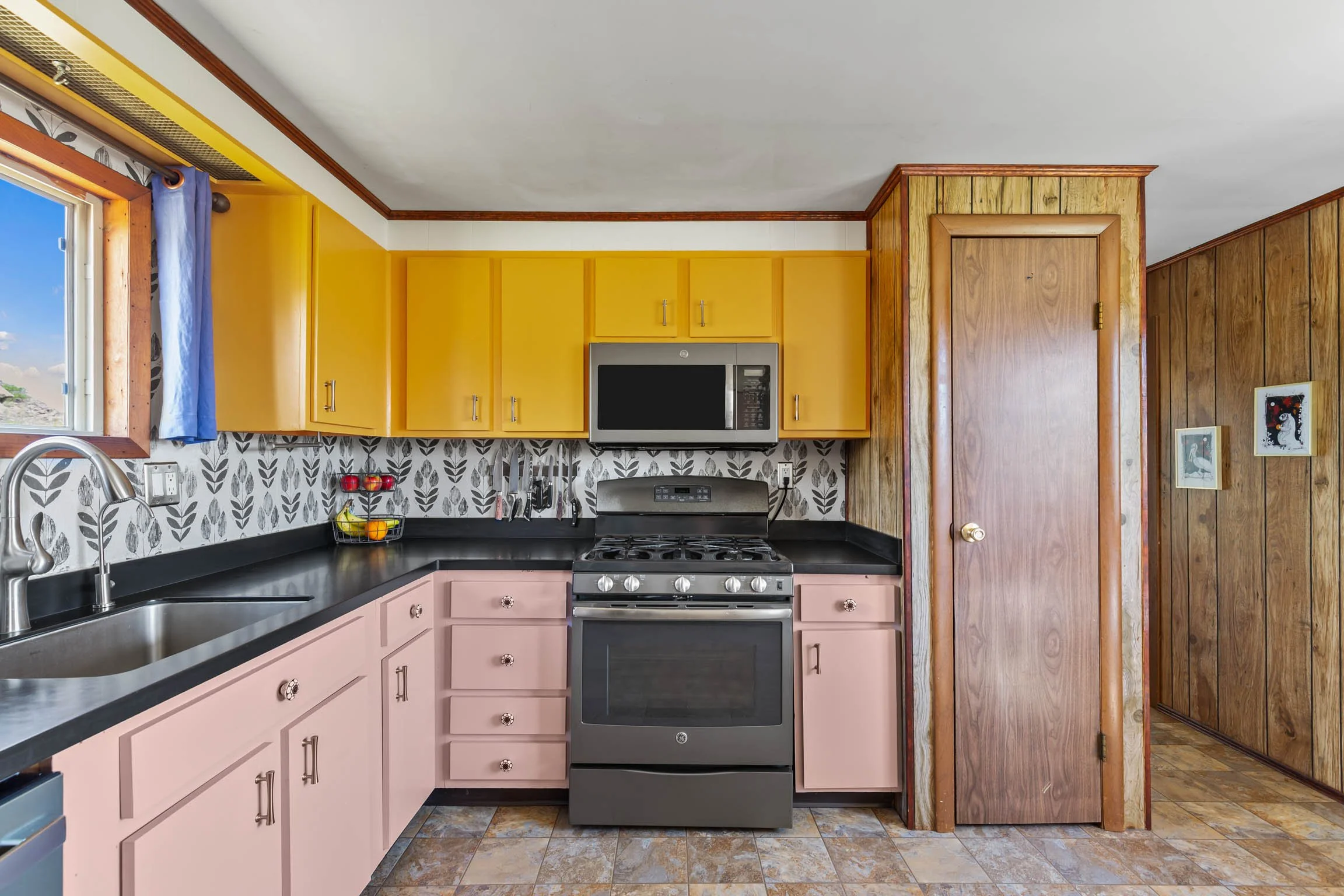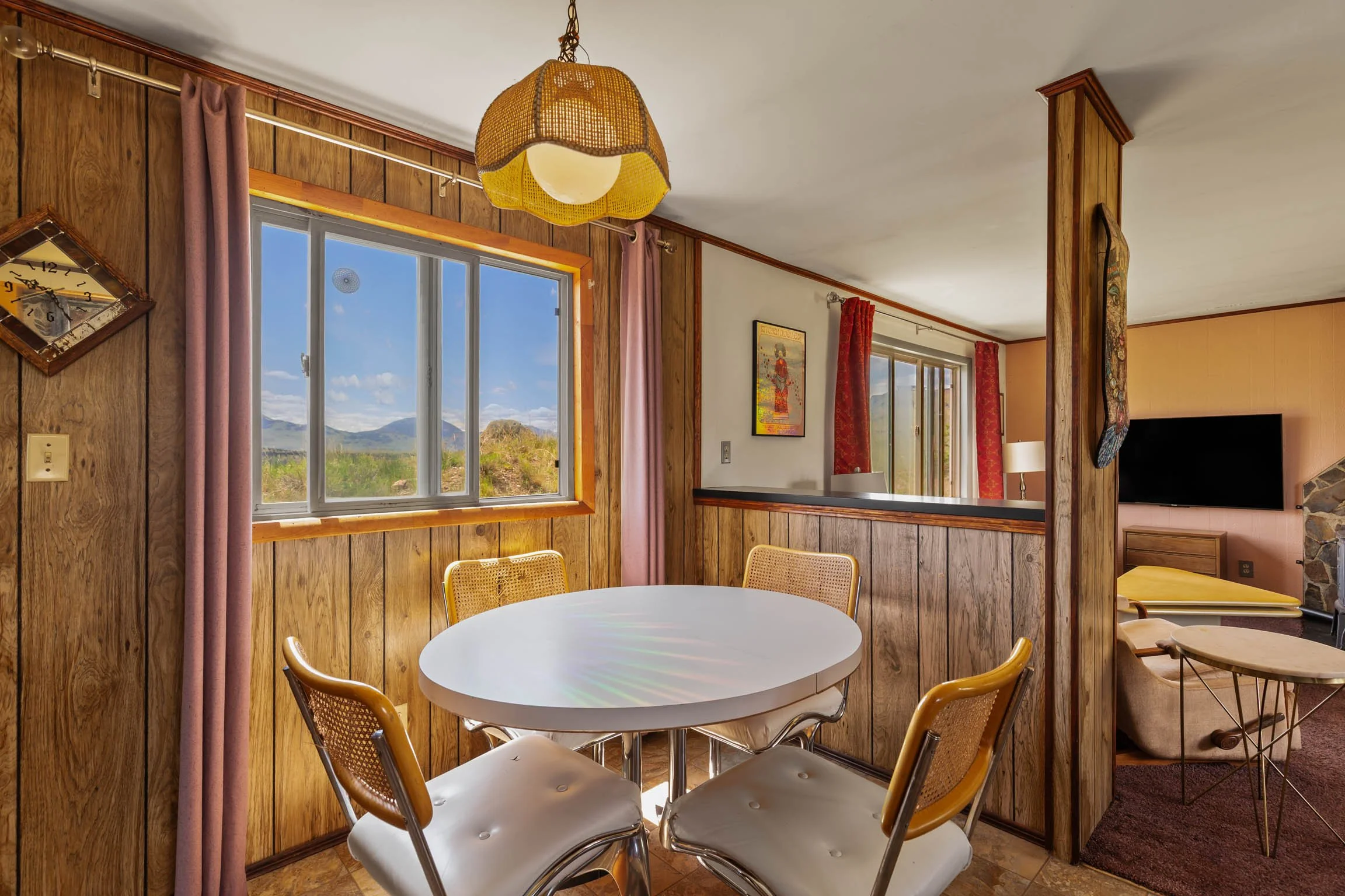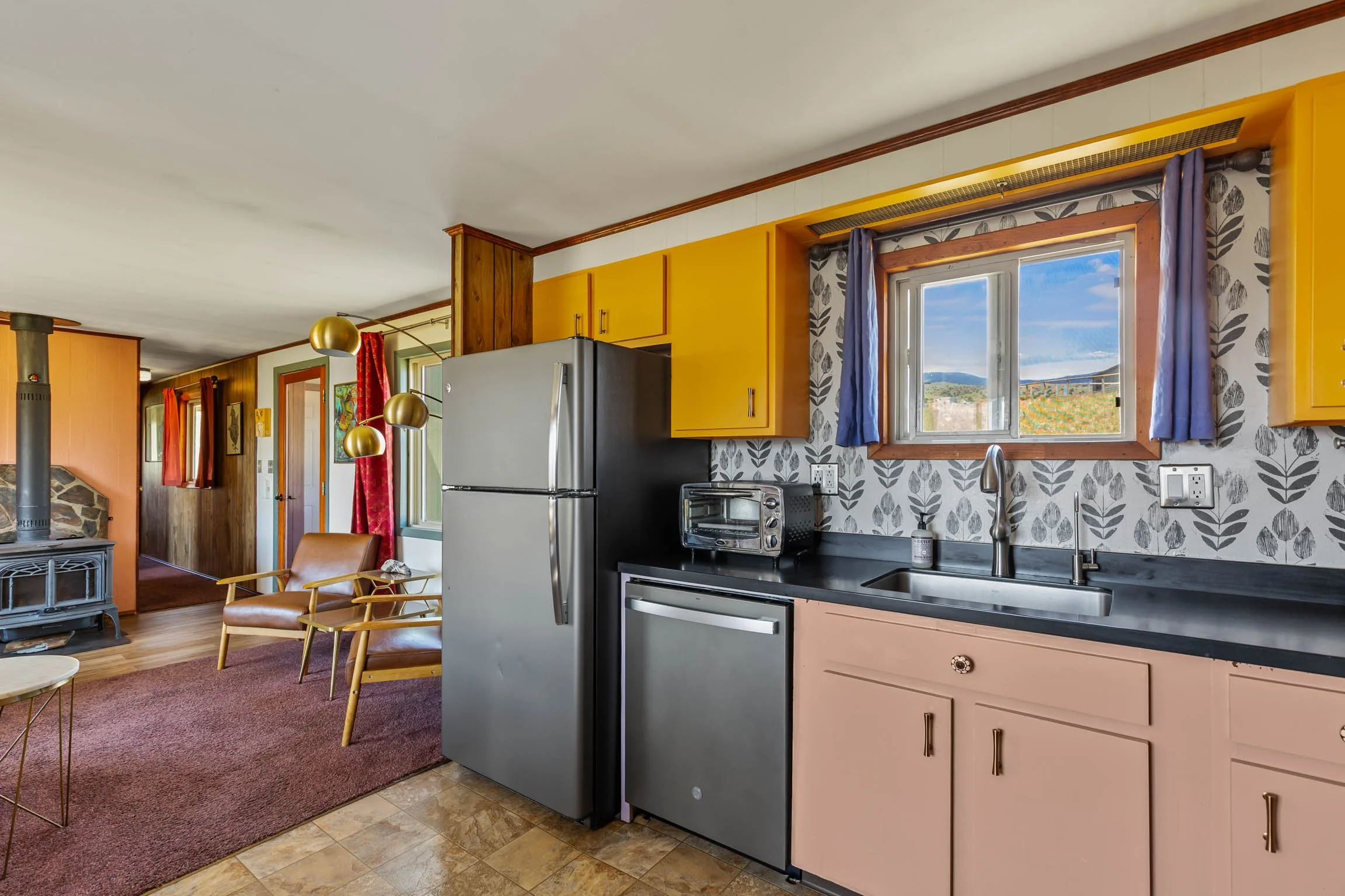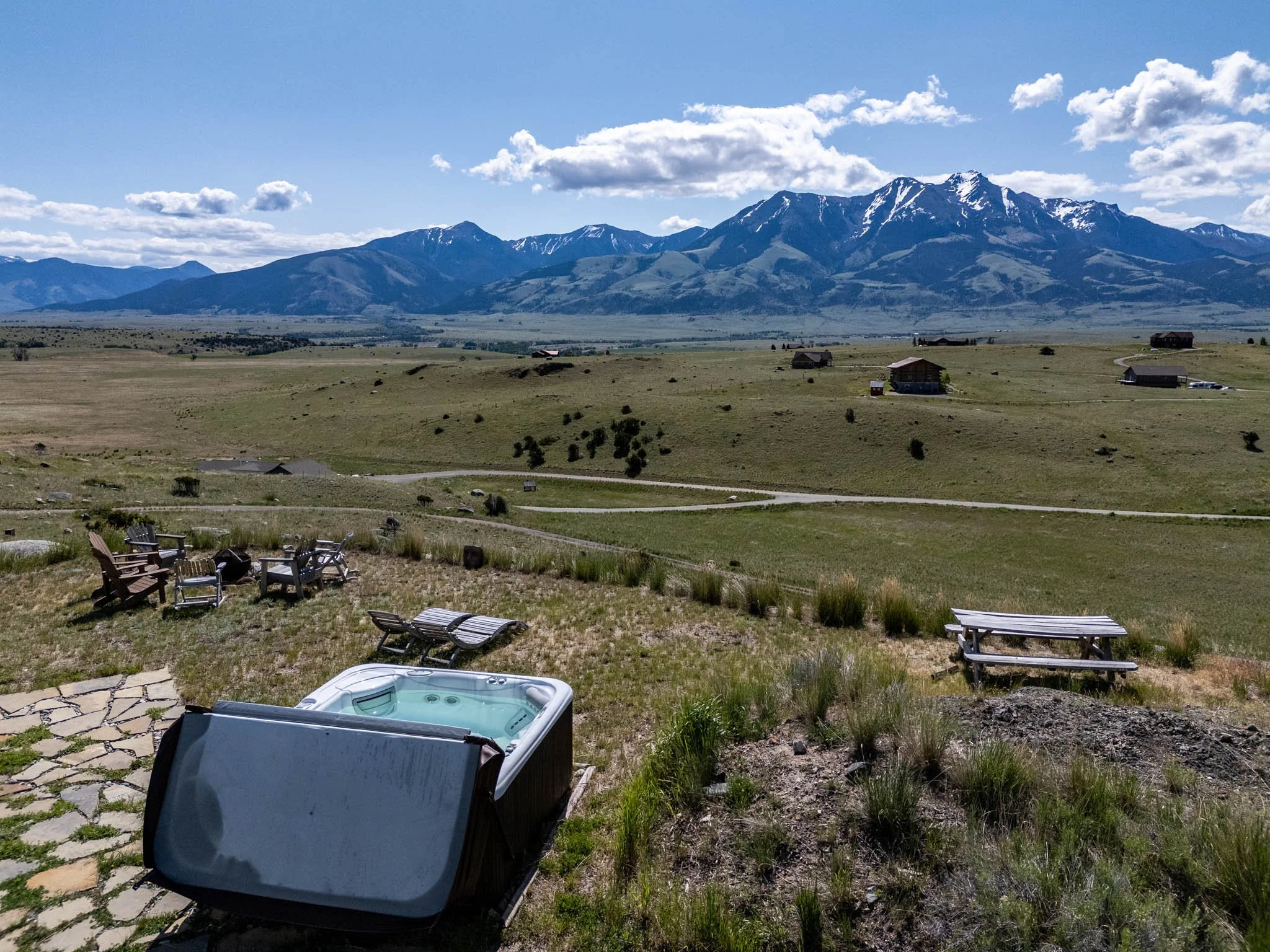 🏡 House Details: 3 beds, 2 baths. Modular home built in 1976; no title required for sale. Newly remodeled in 2019. Well water, gas range stove, kitchen appliances updated in 2019, propane and wood burning heating, large glass sliding doors in front room with 180-degree view of Absorka mountains, 7-person hot tub, washer and dryer, mud room entry, RV 30-amp plug, and potential for fully furnished upon request. The house was thoughtfully designed to bring in elements of the natural world right outside the door. The burgundy / mauve rugs matches many of the rock formations outside and give it that retro vibe, the orange cabinets draw from the lichen on many of the rocks, and the purple-hues draw from the flowers that grow in the summer. The front room, affectionately called the Crown Jewel, has cork floors for warmth during winter months if you are using the room for yoga or exercising, and just an overall high end look. The kitchen has black solid surface counters with grey and black appliances to bring in a modern feel while keeping the original wood-paneled walls honoring the 1970’s roots of the manufactured home. The house has been on Airbnb and rents very successfully, although our ideal buyer would be a mostly full-time resident. Fully furnished upon request, potentially including silverware, plates, cookware, etc.